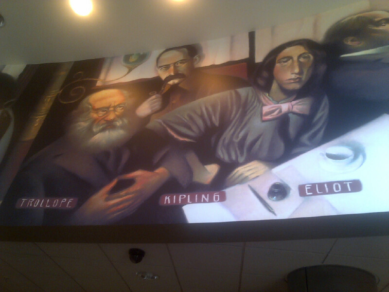 Our first stop was Barnes and Noble to get the books and our wristbands. While we were there we had a bite to eat in the cafe and saw some lovely art along the ceiling. I don't know if all of the stores have them, but ours doesn't, so I thought this was especially cool.